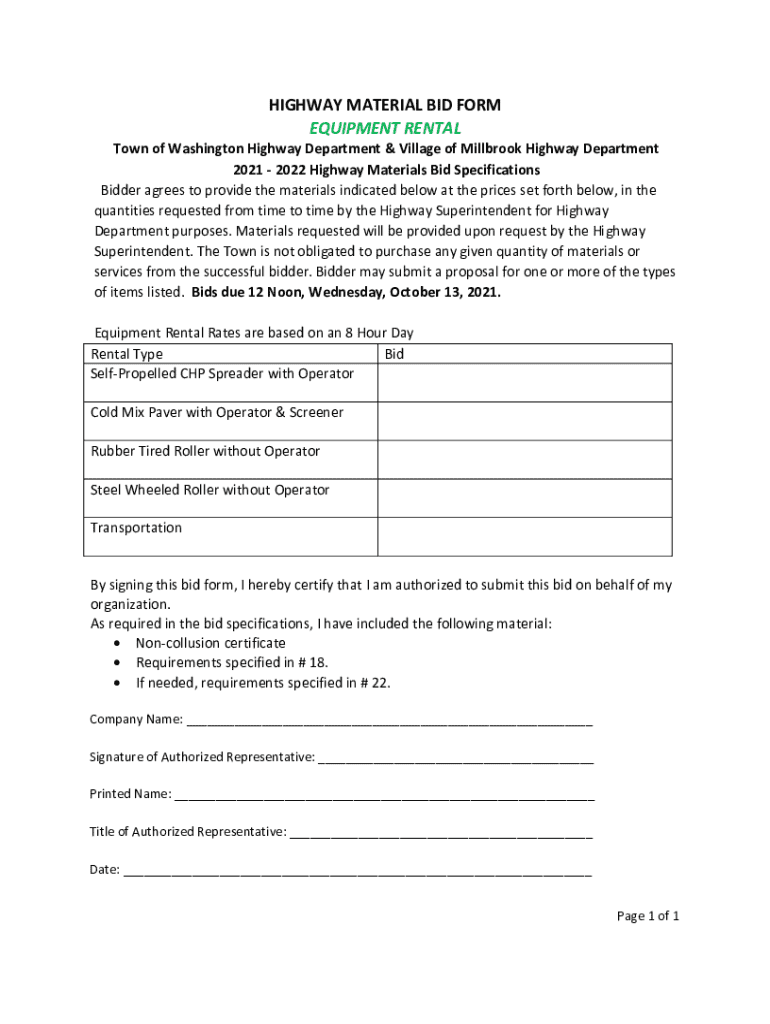 Get the free HIGHWAY MATERIAL BID FORM EQUIPMENT RENTAL
