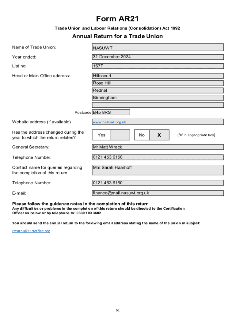 Form AR21 Trade Union and Labour Relations (Consolidation) Act 1992Annual Return for a Trade Union Name of Trade Union:NASUWTYear ended:31 December 2024List no:167THead or Main Office address:Hillscourt