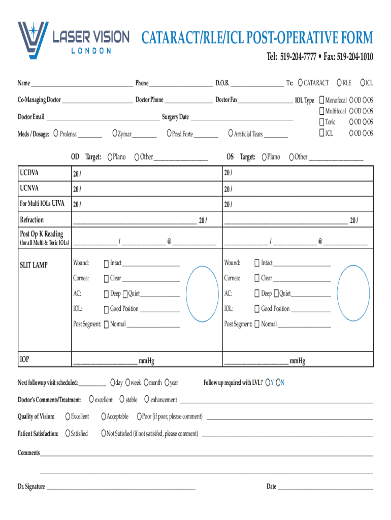 CATARACT/RLE/ICL POSTOPERATIVE FORM Tel: 5192047777Fax: 5192041010 Name___ Phone___ D.O.B.___ Tx:CATARACTCoManaging Doctor___ Doctor Phone___ Doctor Fax___ IOL Type Doctor Email___ Surgery Date___