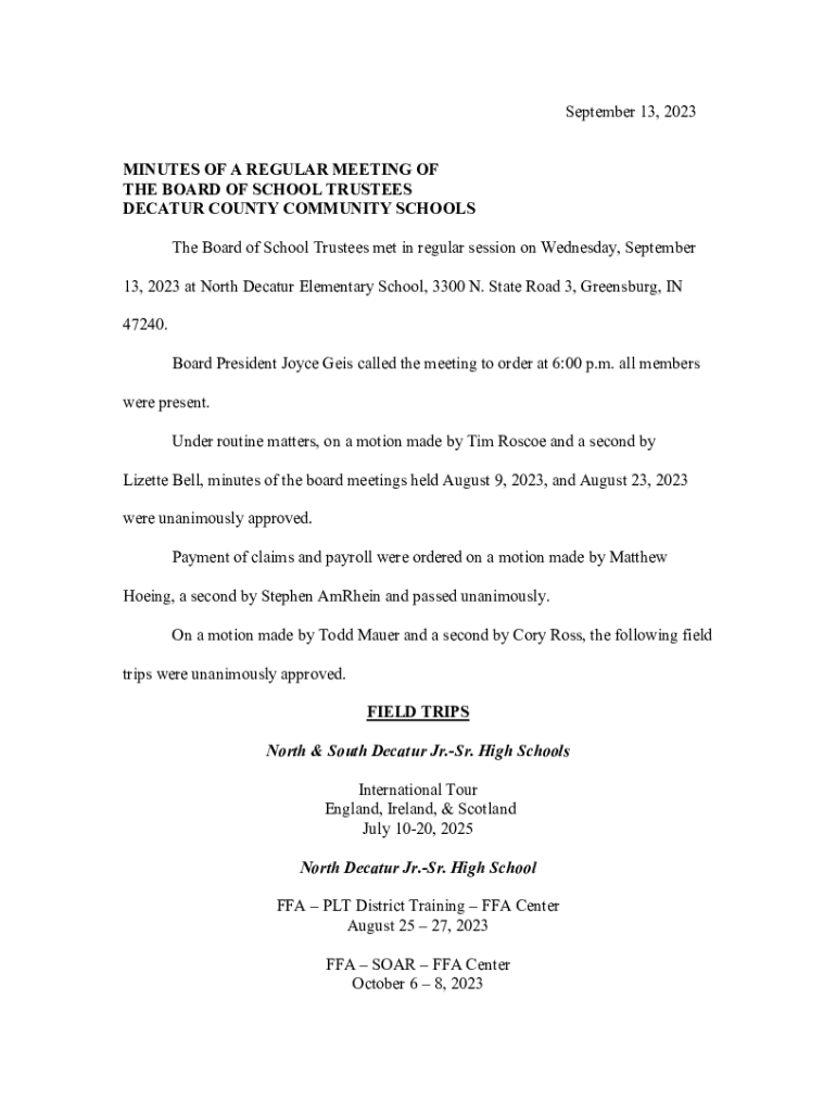 September 13, 2023 MINUTES OF A REGULAR MEETING OF THE BOARD OF SCHOOL TRUSTEES DECATUR COUNTY COMMUNITY SCHOOLS The Board of School Trustees met in regular session on Wednesday, September 13, 2023