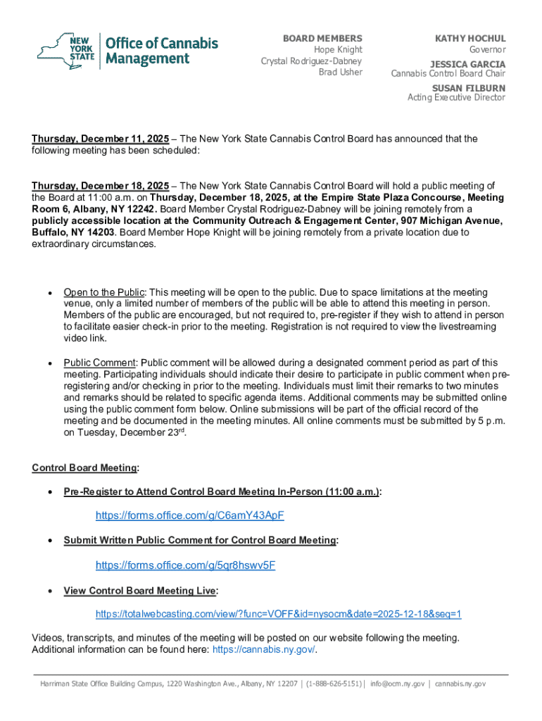 BOARD MEMBERS Hope Knight Crystal RodriguezDabney Brad UsherKATHY HOCHUL Governor JESSICA GARCIA Cannabis Control Board Chair SUSAN FILBURN Acting Executive DirectorThursday, December 11, 2025The