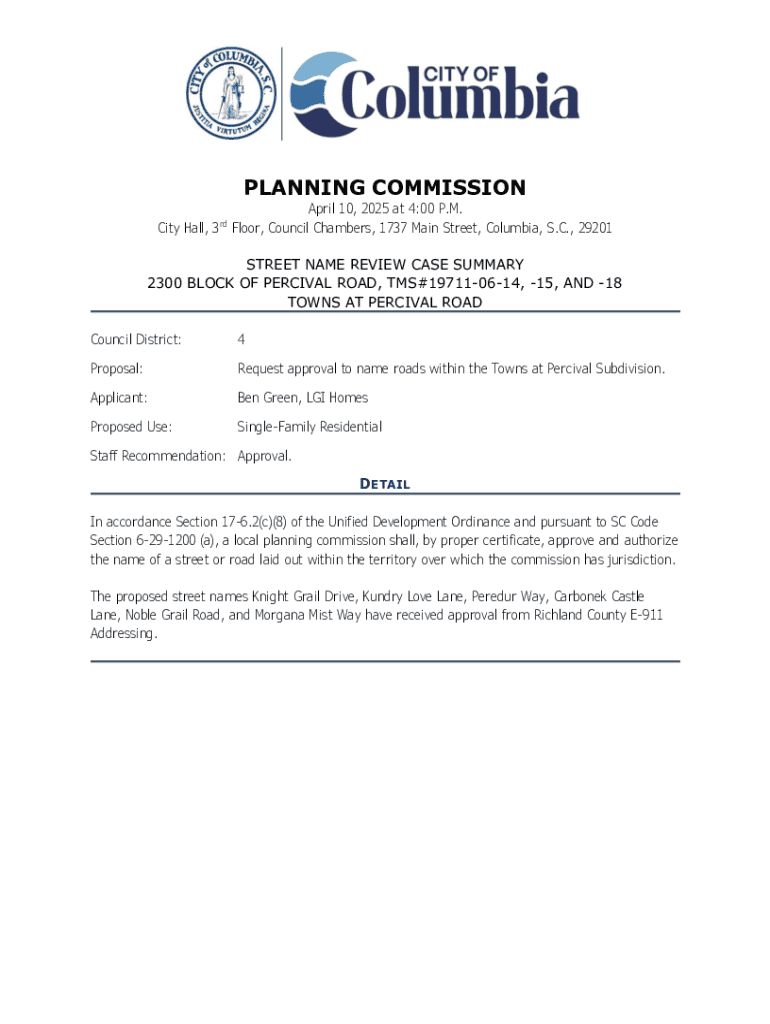 PLANNING COMMISSIONApril 10, 2025 at 4:00 P.M. City Hall, 3rd Floor, Council Chambers, 1737 Main Street, Columbia, S.C., 29201 STREET NAME REVIEW CASE SUMMARY 2300 BLOCK OF PERCIVAL ROAD, TMS#197110614,