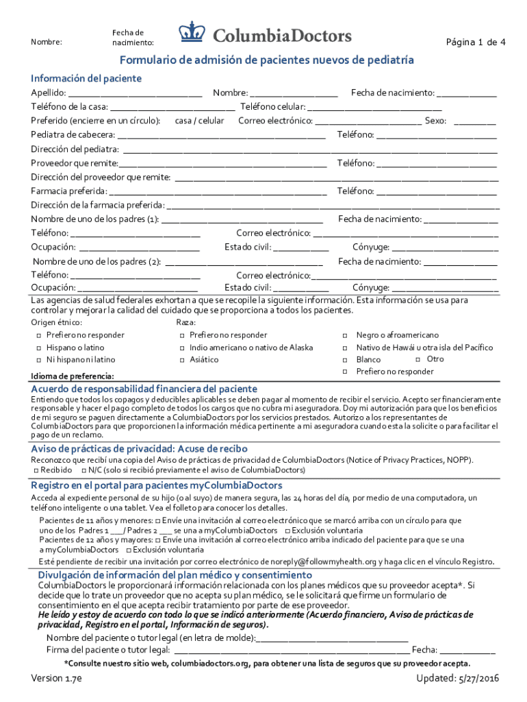 Obtener el gratis Formulario de admisin de pacientes nuevos de pediatra