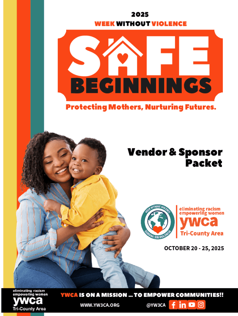 2025 WEEK WITHOUT VIOLENCESAFEBEGINNINGSProtecting Mothers, Nurturing Futures.Vendor & Sponsor PacketOCTOBER 2025, 2025YWCA IS ON A MISSION ... TO EMPOWER COMMUNITIES!! WWW.YW3CA.ORG@YW3CANATIONWIDEWEEK
