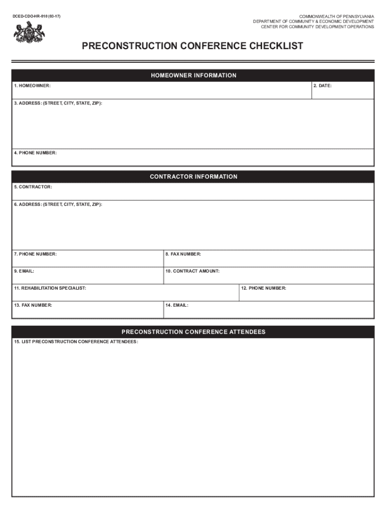 DCEDCDOHR010 (0317)COMMONWEALTH OF PENNSYLVANIA DEPARTMENT OF COMMUNITY & ECONOMIC DEVELOPMENT CENTER FOR COMMUNITY DEVELOPMENT OPERATIONSPRECONSTRUCTION CONFERENCE CHECKLIST HOMEOWNER INFORMATION