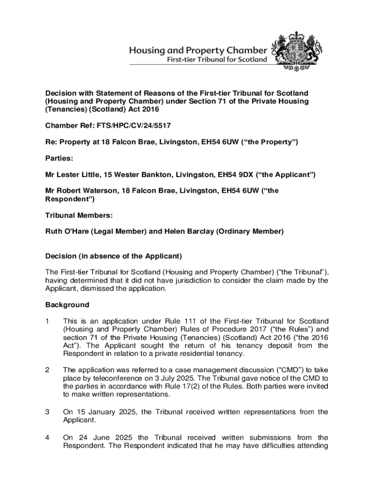 Decision with Statement of Reasons of the Firsttier Tribunal for Scotland (Housing and Property Chamber) under Section 71 of the Private Housing (Tenancies) (Scotland) Act 2016 Chamber Ref: FTS/HPC/CV/24/5517