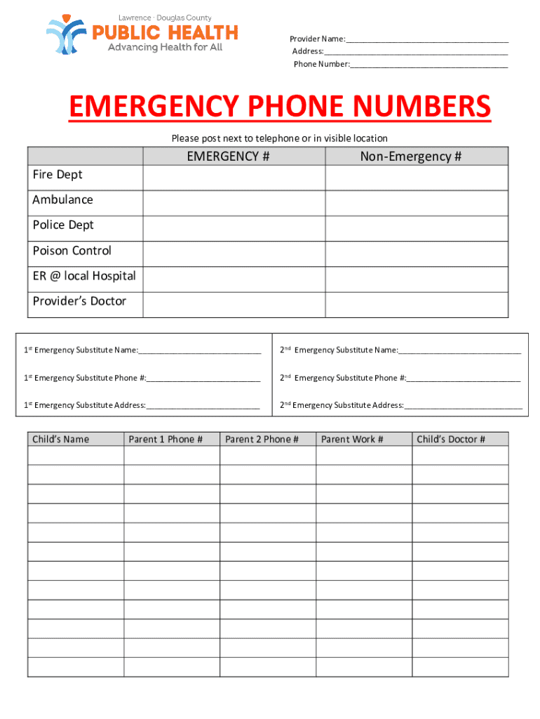 Provider Name:___ Address:___ Phone Number:___EMERGENCY PHONE NUMBERS Please post next to telephone or in visible locationEMERGENCY #NonEmergency #Fire Dept Ambulance Police Dept Poison Control ER