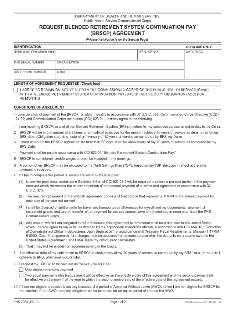 Get the free FORM PHS-7084. Request Blended Retirement System Continuation Pay (BRSCP) Agreement ...