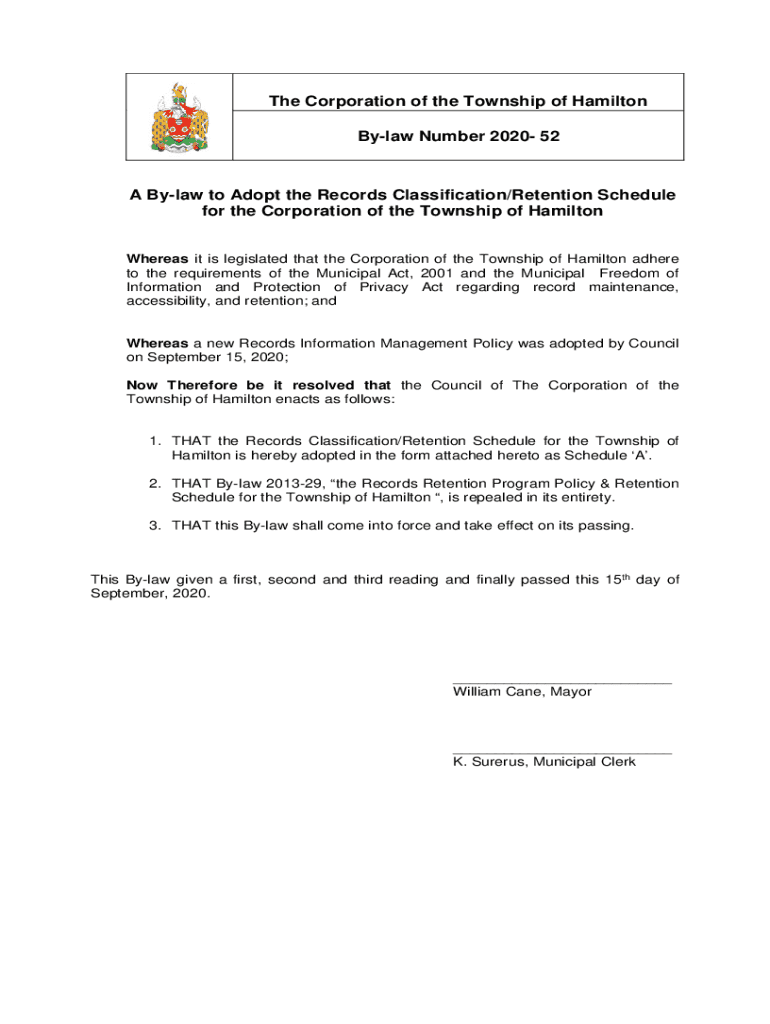 Get the free 52 A By-law to Adopt the Records Classification/Retention ...