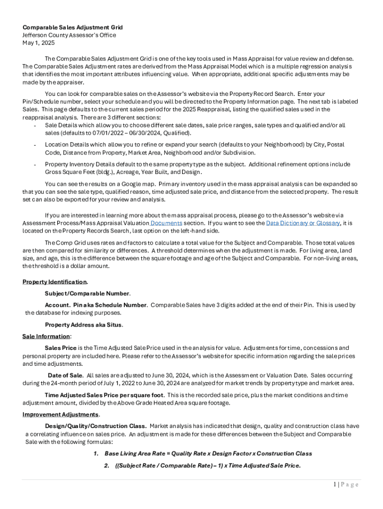 Comparable Sales Adjustment Grid Jefferson County Assessor\'s Office May 1, 2025 The Comparable Sales Adjustment Grid is one of the key tools used in Mass Appraisal for value review and defense. The