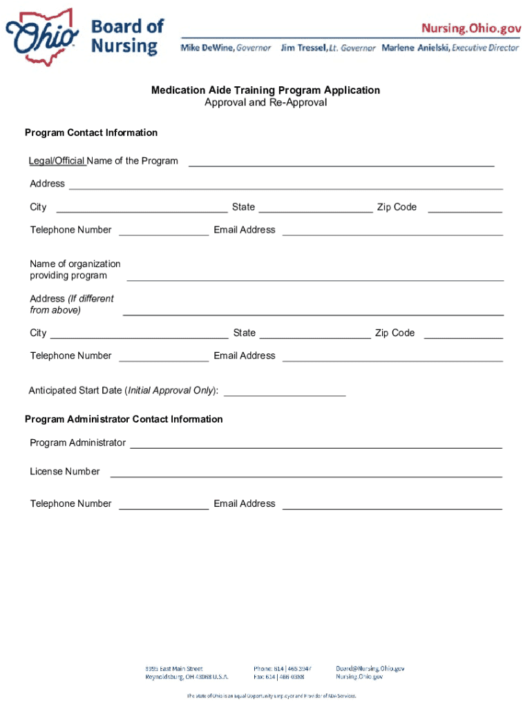 Medication Aide Training Program Application Approval and ReApproval Program Contact Information Legal/Official Name of the Program Address City Telephone NumberStateZip CodeEmail AddressName of organization