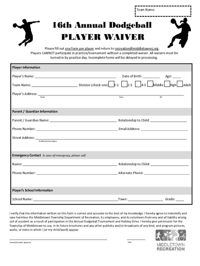 Team Name:16th Annual Dodgeball PLAYER WAIVER Please fill out one form per player and return to recreation@middletownnj.org. Players CANNOT participate in practice/tournament without a completed waiver.