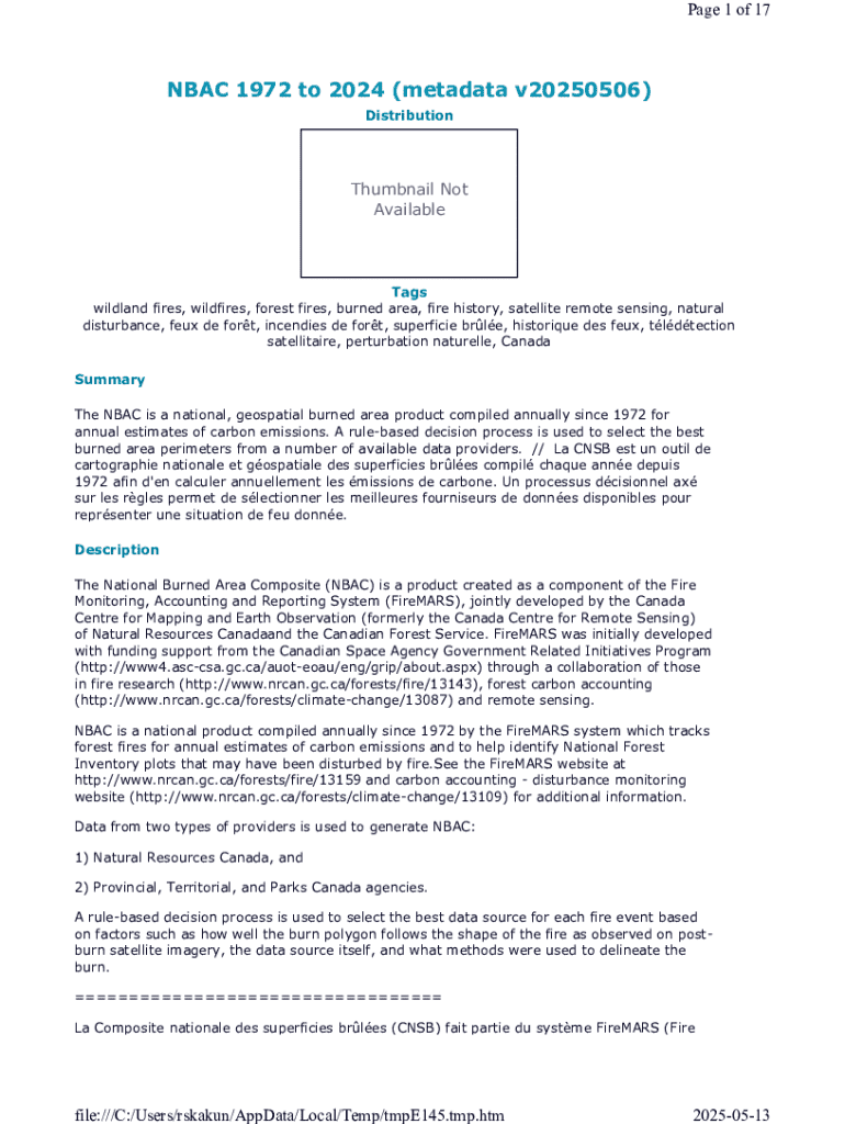 Page 1 of 17NBAC 1972 to 2024 (metadata v20250506) DistributionThumbnail Not AvailableTags wildland fires, wildfires, forest fires, burned area, fire history, satellite remote sensing, natural disturbance,