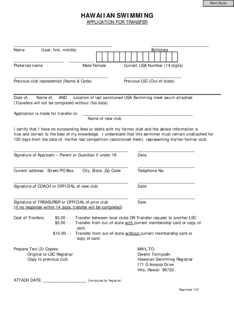 Print FormHAWAIIAN SWIMMING APPLICATION FOR TRANSFER___ Name (Last, first, middle) ___ Preferred name___ Birthdate___ __ __ __ __ __ __ __ __ __ __ __ __ __ __ Male/Female Current USA Number (14 digits)___
