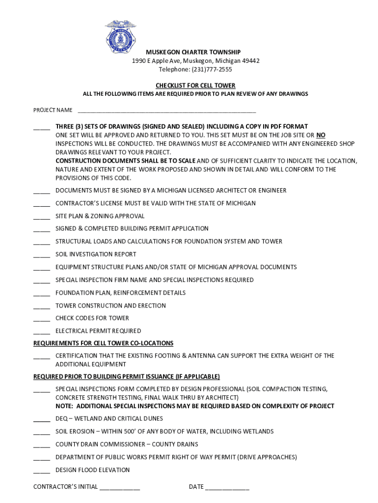 MUSKEGON CHARTER TOWNSHIP 1990 E Apple Ave, Muskegon, Michigan 49442 Telephone: (231)7772555 CHECKLIST FOR CELL TOWER ALL THE FOLLOWING ITEMS ARE REQUIRED PRIOR TO PLAN REVIEW OF ANY DRAWINGS PROJECT