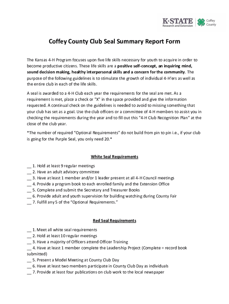 Get the free 4-H Club Forms - Coffey County Extension Office