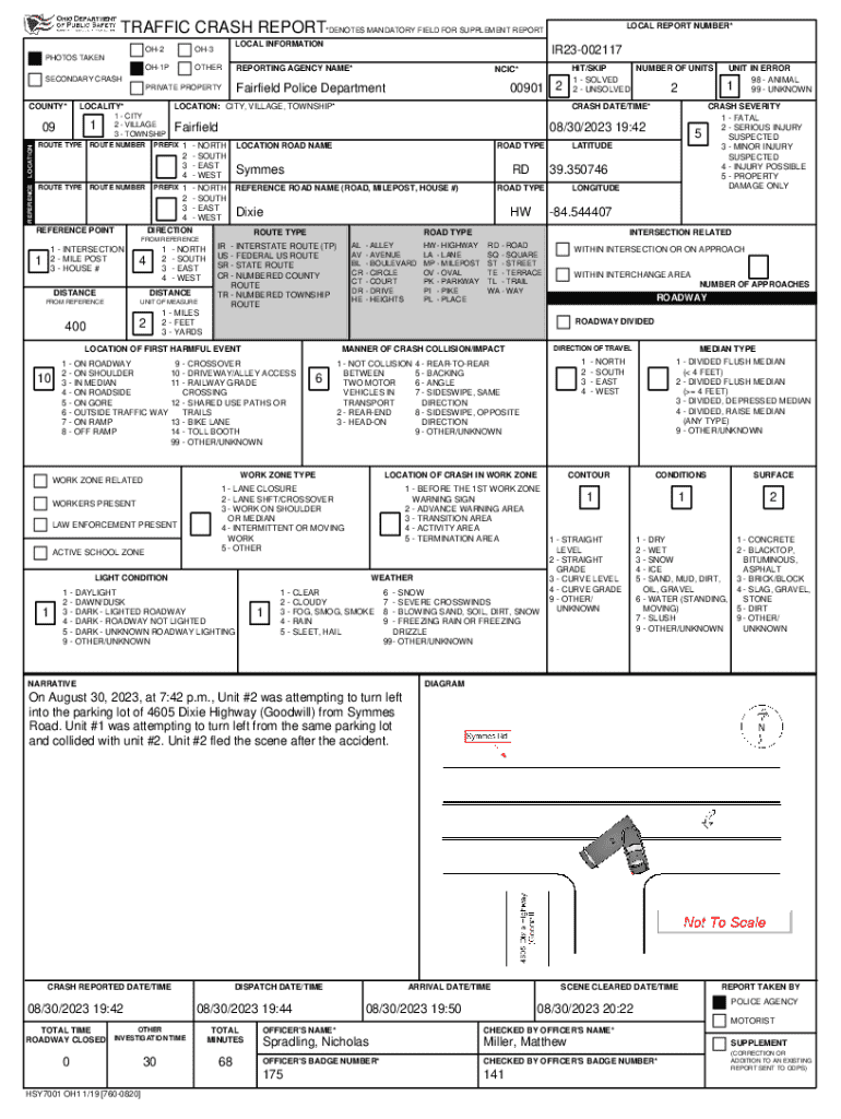 TRAFFIC CRASH REPORT*DENOTES MANDATORY FIELD FOR SUPPLEMENT REPORT LOCAL INFORMATIONOH2OH3OH1POTHERIR23002117PHOTOS TAKENREPORTING AGENCY NAME*SECONDARY CRASHREFERENCE LOCATIONCOUNTY*LOCALITY*NCIC*00901