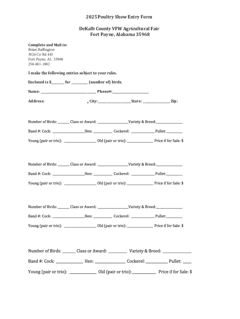 Get the free 2025 Poultry Show Entry Form DeKalb County VFW Agricultural Fair ...