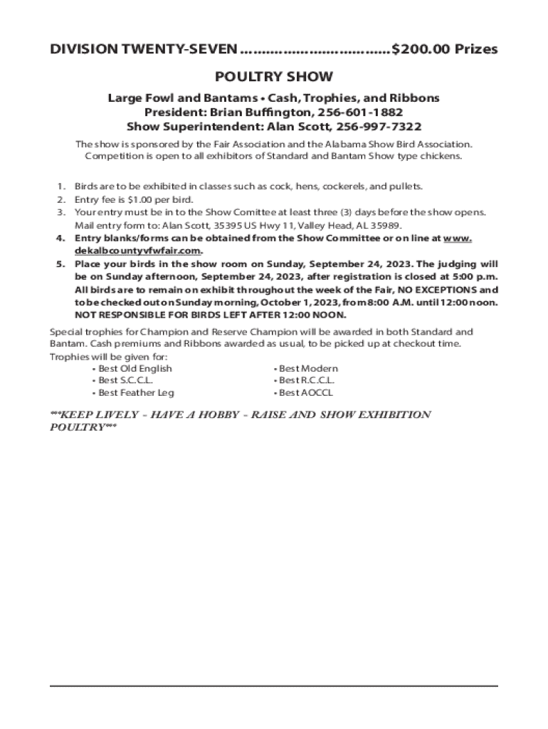 Anyone involved in hosting or participating in poultry events should use the Division Twenty-Seven Poultry Form. This includes farmers, breeders, and exhibitors who need to provide accurate information for various administrative processes. The importance of this form can’t be overstated as it not only represents the exhibitor's poultry accurately but also complies with local regulations, such as those from Dekalb County and other jurisdictions.