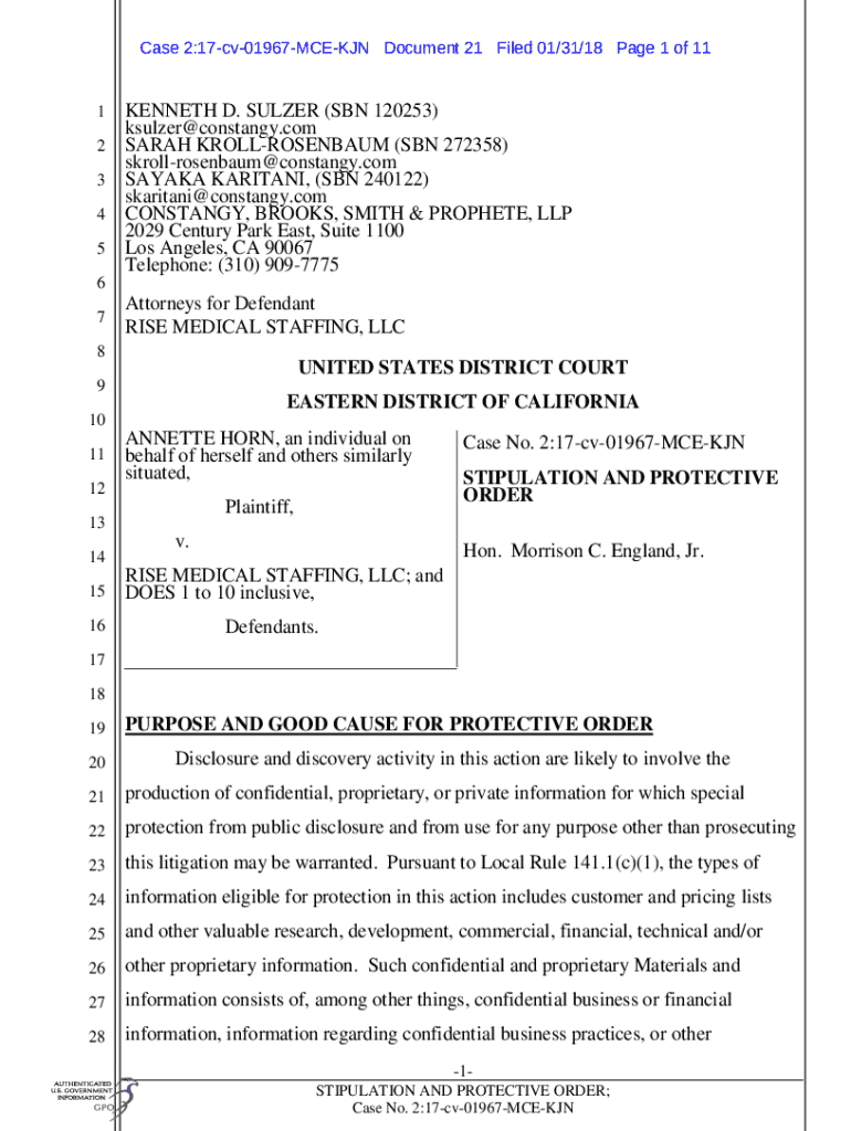 Case 2:17cv01967MCEKJN Document 21 Filed 01/31/18 Page 1 of 111 2 3 4 5KENNETH D. SULZER (SBN 120253) ksulzer@constangy.com SARAH KROLLROSENBAUM (SBN 272358) skrollrosenbaum@constangy.com SAYAKA KARITANI,