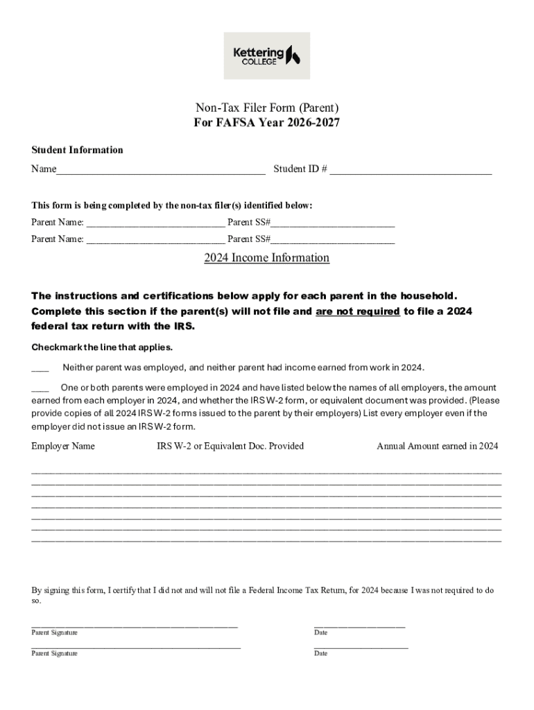 Get the free Non-Tax Filer Form (Parent) For FAFSA Year 2026-2027