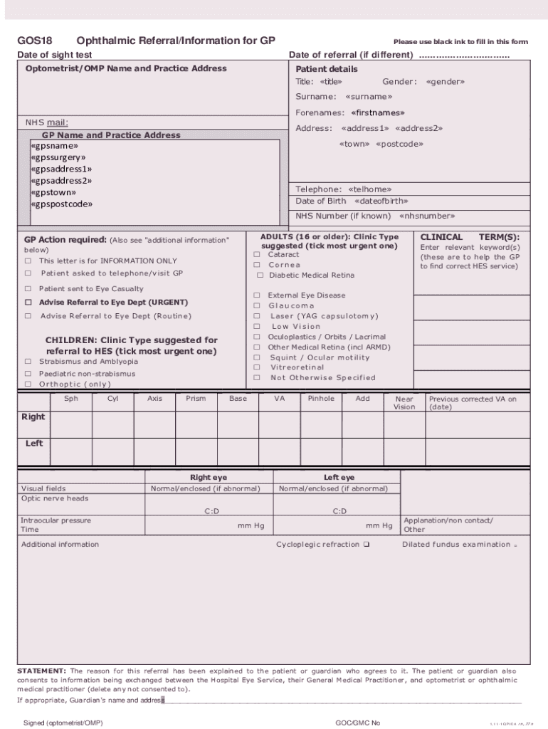 The GOS18 Referral Form plays a pivotal role in healthcare referrals within the UK, particularly for ophthalmic services. This form facilitates efficient communication among healthcare providers, ensuring that patients receive appropriate care promptly. Its structured format is designed to minimize errors and provide essential information to specialists, thereby streamlining the referral process.