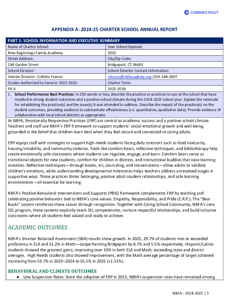 APPENDIX A: 202425 CHARTER SCHOOL ANNUAL REPORT PART 1: SCHOOL INFORMATION AND EXECUTIVE SUMMARY Name of Charter School: Year School Opened: New Beginnings Family Academy 2002 Street Address: City/Zip