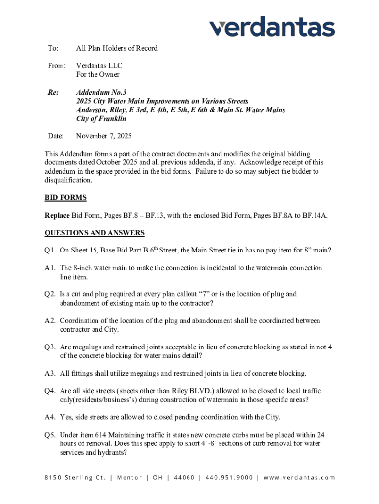 To:All Plan Holders of RecordFrom:Verdantas LLC For the OwnerRe:Addendum No.3 2025 City Water Main Improvements on Various Streets Anderson, Riley, E 3rd, E 4th, E 5th, E 6th & Main St. Water Mains