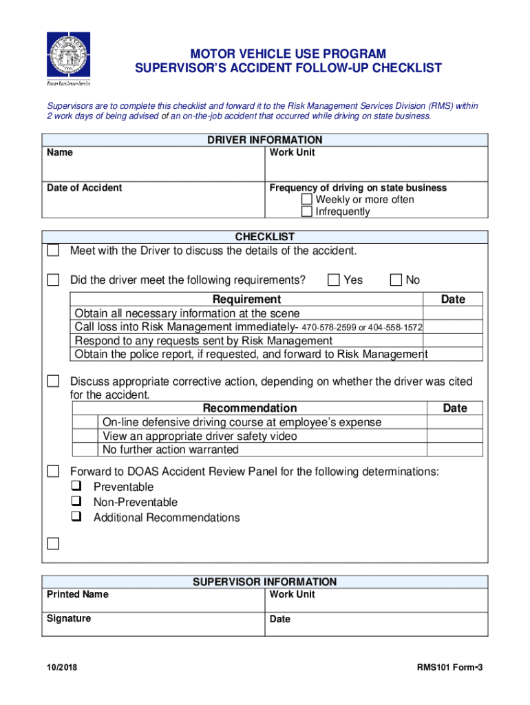 MOTOR VEHICLE USE PROGRAM SUPERVISORS ACCIDENT FOLLOWUP CHECKLIST Supervisors are to complete this checklist and forward it to the Risk Management Services Division (RMS) within 2 work days of being