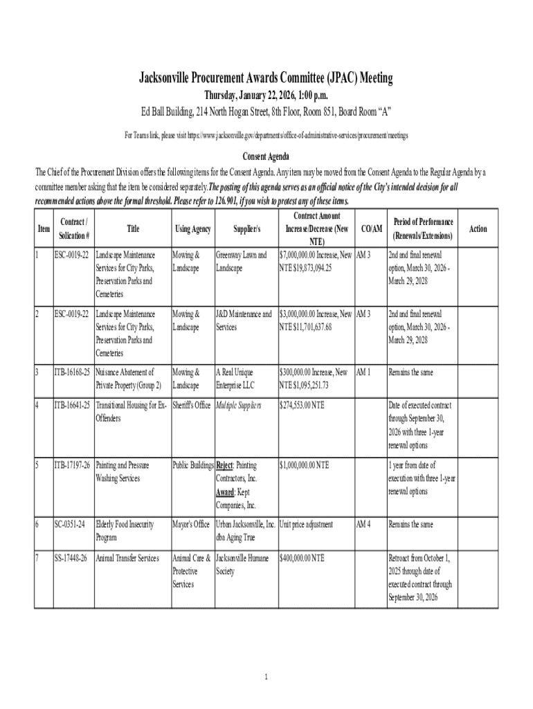 Jacksonville Procurement Awards Committee (JPAC) Meeting Thursday, January 22, 2026, 1:00 p.m. Ed Ball Building, 214 North Hogan Street, 8th Floor, Room 851, Board Room A For Teams link, please visit