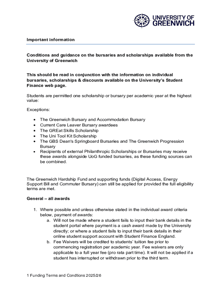 Important informationConditions and guidance on the bursaries and scholarships available from the University of Greenwich This should be read in conjunction with the information on individual bursaries,