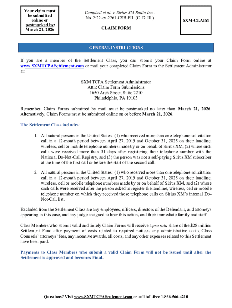 Get the free Submit Claim - Campbell et al. v. Sirius XM Radio Inc.