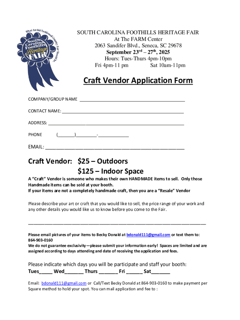 The Discover Form is essential for both attendees and participants wishing to make the most of the SC Foothills Heritage Fair. For vendors, it serves as a way to secure a space at the fair, while attendees can use it to plan their visit effectively. Early submission of this form helps event organizers gauge participation, improve logistics, and enhance the overall experience for everyone involved.