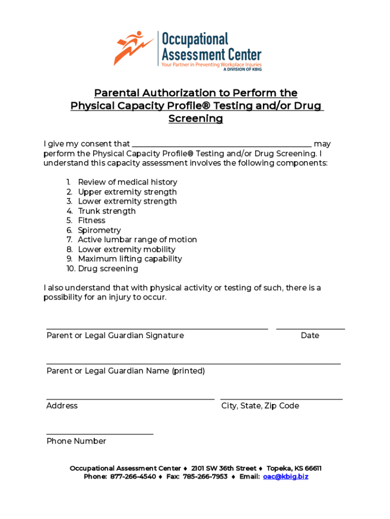 Get the free Parental Authorization to Perform the Physical Capacity Profile ...