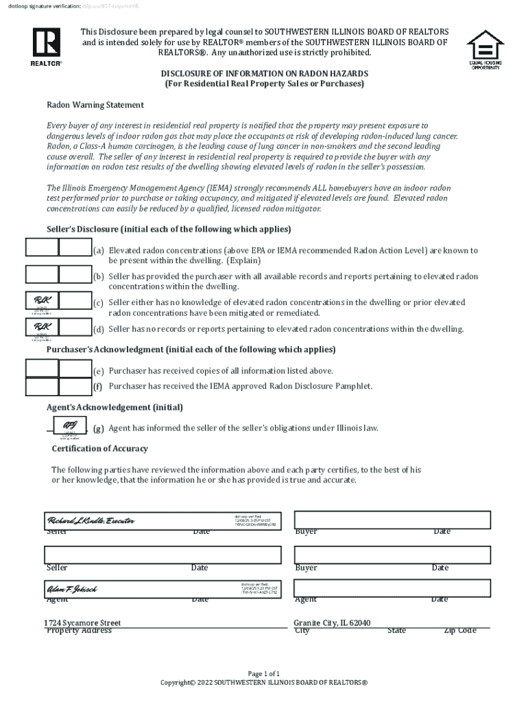 dotloop signature verification: dtlp.us/8I5TtvquNeWEThis Disclosure been prepared by legal counsel to SOUTHWESTERN ILLINOIS BOARD OF REALTORS and is intended solely for use by REALTOR members of the