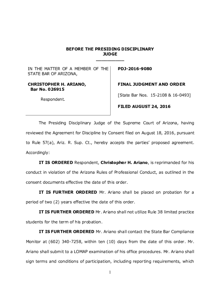 BEFORE THE PRESIDING DISCIPLINARY JUDGE ___ IN THE MATTER OF A MEMBER OF THE STATE BAR OF ARIZONA,PDJ20169080CHRISTOPHER H. ARIANO, Bar No. 026915FINAL JUDGMENT AND ORDER [State Bar Nos. 152108 &