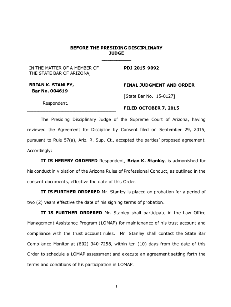 To grasp the significance of the Brian K Stanley Bar Form, it's essential to examine its legal context. Brian K. Stanley, a Phoenix-based attorney, has been subject to various legal actions that underscore the necessity for heightened scrutiny in the legal profession. Prior agreements related to consent discipline by consent reflect the ongoing challenges faced by attorneys in upholding ethical standards while navigating personal and professional circumstances. These past legal actions indicate the need for vigilance and compliance among legal practitioners, signaling the implications that may arise from inadequate adherence to ethical guidelines.