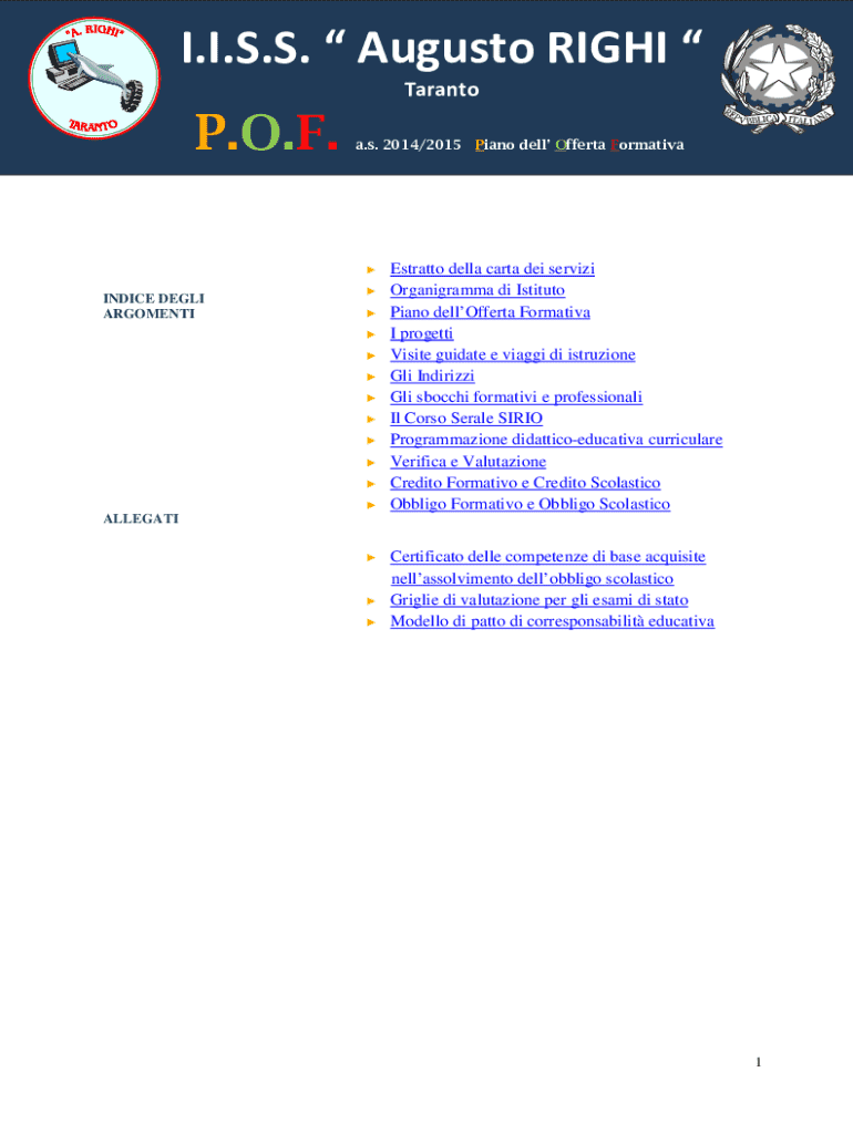I.I.S.S.Augusto RIGHITarantoP.O.F.a.s. 2014/2015 Piano dell Offerta FormativaINDICE DEGLI ARGOMENTIEstratto della carta dei servizi Organigramma di Istituto Piano dellOfferta Formativa I progetti