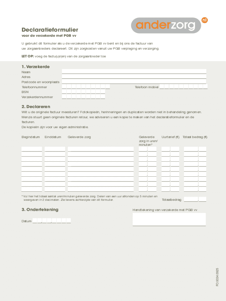 Declaratieformulier voor de verzekerde met PGB vv U gebruikt dit formulier als u de verzekerde met PGB vv bent en bij ons de factuur vanuw zorgaanbieders declareert. Dit zijn zorgkosten vanuit uw