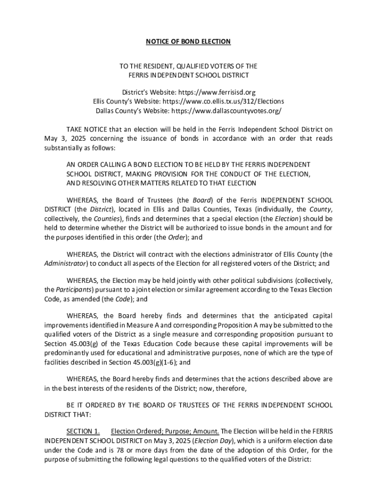 NOTICE OF BOND ELECTION TO THE RESIDENT, QUALIFIED VOTERS OF THE FERRIS INDEPENDENT SCHOOL DISTRICT Districts Website: https://www.ferrisisd.org Ellis Countys Website: https://www.co.ellis.tx.us/312/Elections