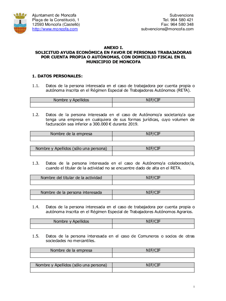 Ajuntament de Moncofa Plaa de la Constituci, 1 12593 Moncofa (Castell) http://www.moncofa.comSubvencions Tel. 964 580 421 Fax: 964 580 348 subvencions@moncofa.comANEXO I. SOLICITUD AYUDA ECONMICA