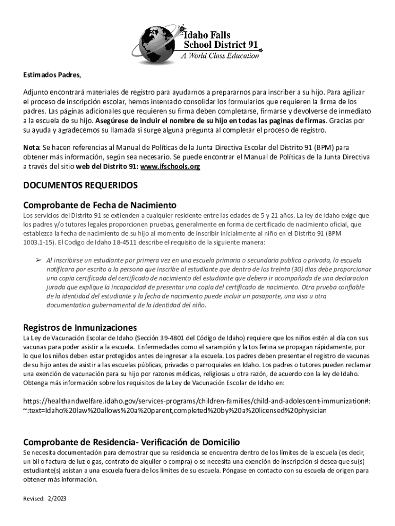 Estimados Padres, Adjunto encontrar materiales de registro para ayudarnos a prepararnos para inscriber a su hijo. Para agilizar el proceso de inscripcin escolar, hemos intentado consolidar los formularios