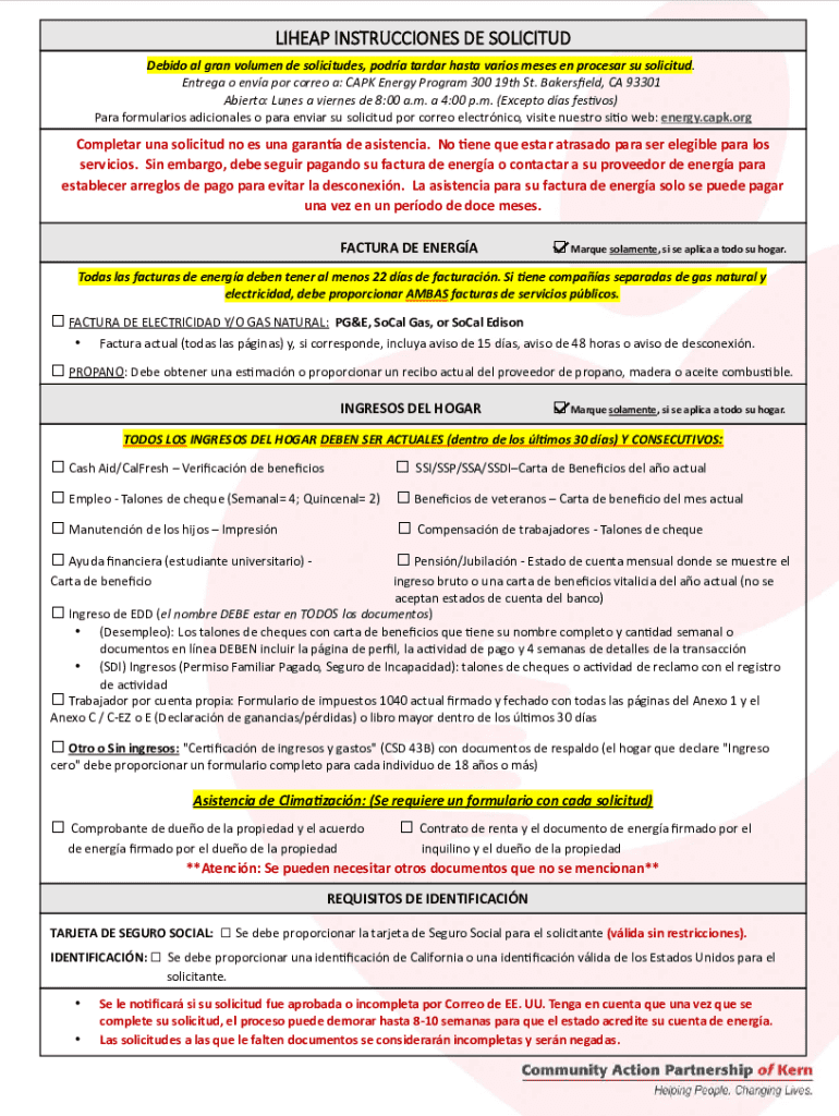 LIHEAP INSTRUCCIONES DE SOLICITUD Debido al gran volumen de solicitudes, podra tardar hasta varios meses en procesar su solicitud. Entrega o enva por correo a: CAPK Energy Program 300 19th St. Bakerseld,