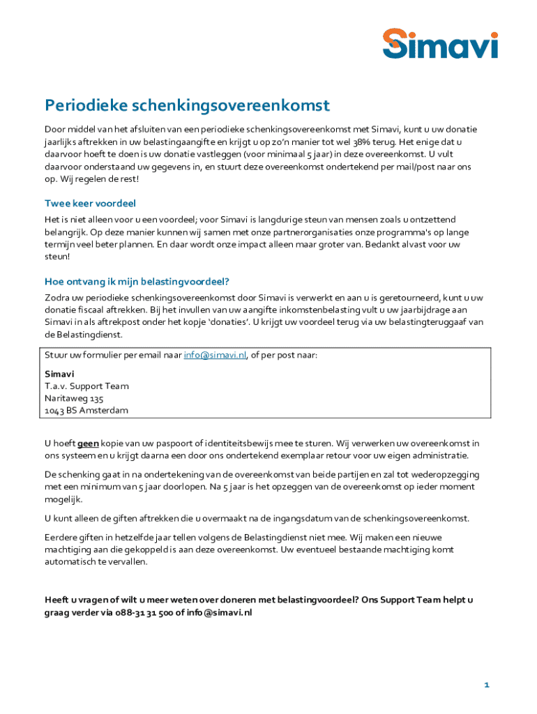 Periodieke schenkingsovereenkomst Door middel van het afsluiten van een periodieke schenkingsovereenkomst met Simavi, kunt u uw donatie jaarlijks aftrekken in uw belastingaangifte en krijgt u op zon