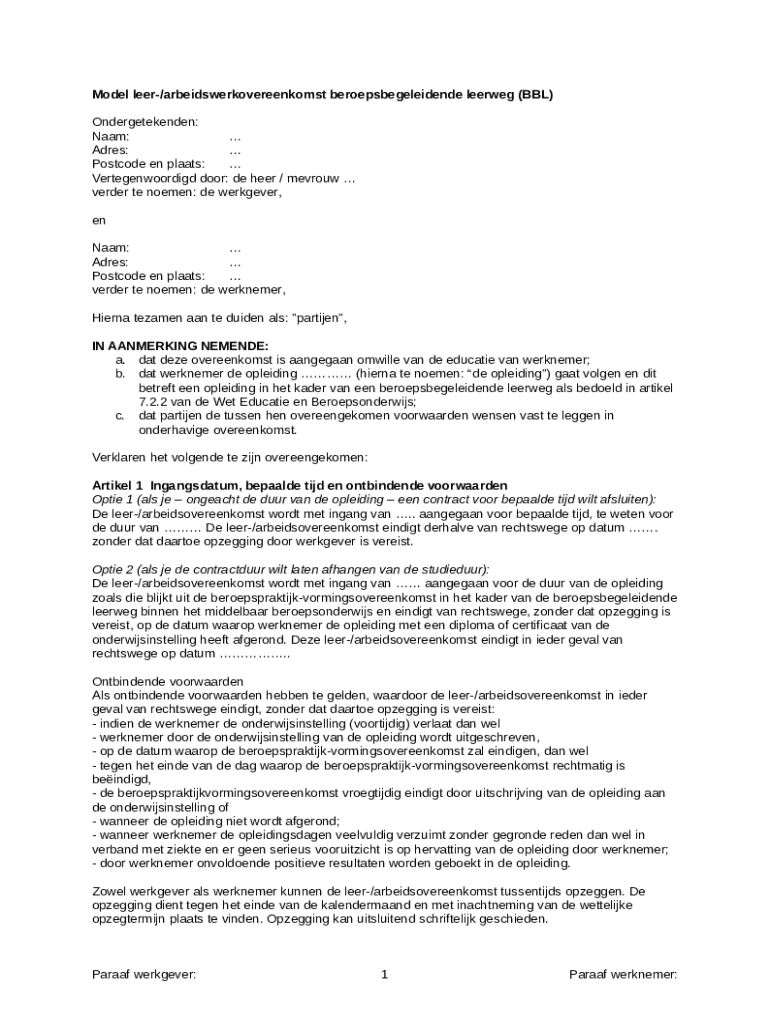 Instructions for the Toelichting model BBL- leer/arbeidsovereenkomst form