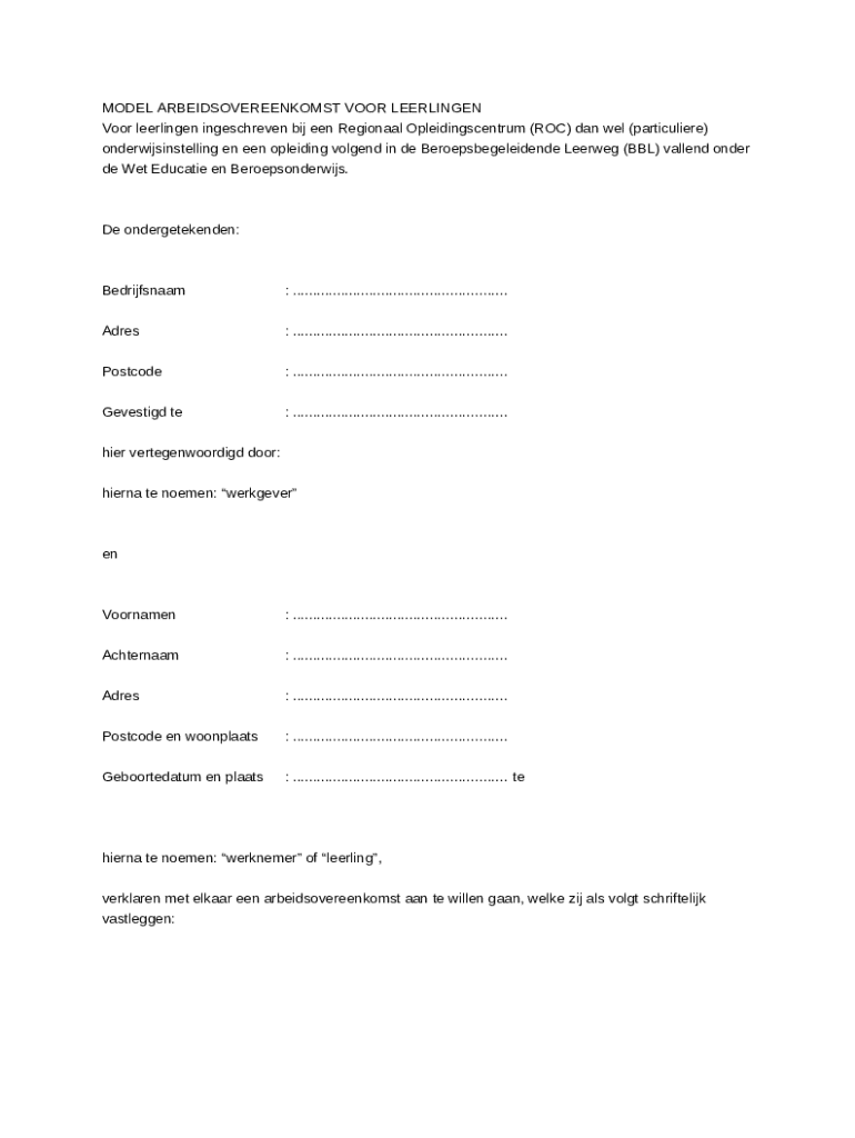 LHV-model Leer-/arbeidsovereenkomst (BBL) template instructions