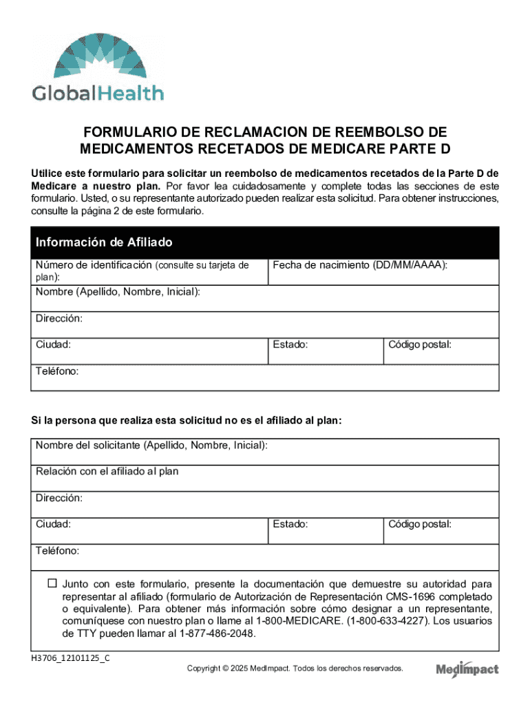 FORMULARIO DE RECLAMACION DE REEMBOLSO DE MEDICAMENTOS RECETADOS DE MEDICARE PARTE D Utilice este formulario para solicitar un reembolso de medicamentos recetados de la Parte D de Medicare a nuestro