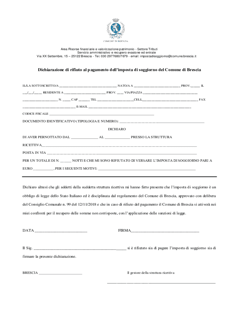 Ottieni il gratuito Dichiarazione di rifiuti al pagamento dellimposta di soggiorno del Comune di ...