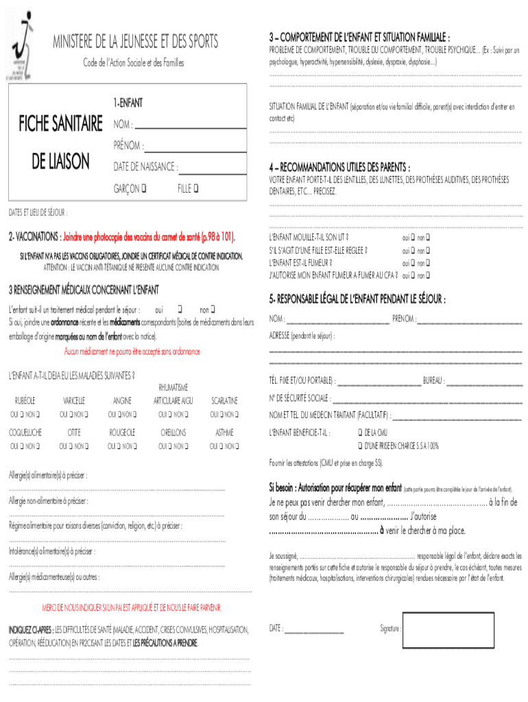Obtenir le gratuit Code de l'action sociale et des familles Fiche sanitaire de liaison