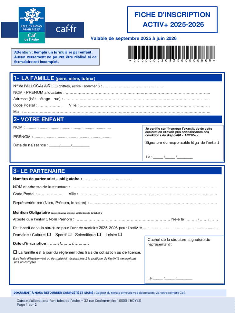FICHE D\'INSCRIPTION ACTIV+ 20252026 Valable de septembre 2025juin 2026 Attention : Remplir un formulaire par enfant. Aucun versement ne pourra tre ralis si ce formulaire est incomplet. 1 LA FAMILLE